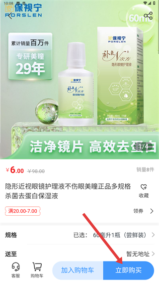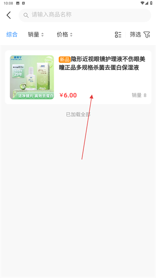 3、在护理液商品列表,点击目标商品,进入详情页,查看【6】元价、【8】销量等信息。