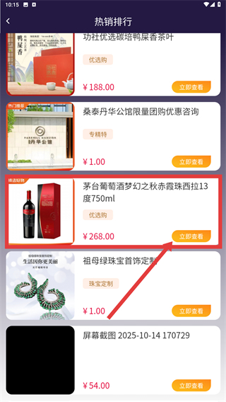 2、热销排行中找到【茅台葡萄酒-梦幻之秋-赤霞珠西拉13度-750ml】,点击【立即查看】进详情。