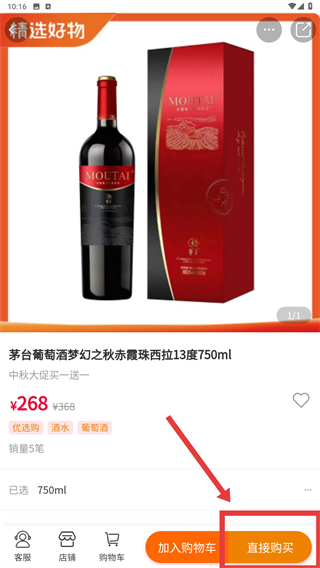 4、购买确认界面调整数量,点击【直接购买】,完成【茅台葡萄酒-梦幻之秋-赤霞珠西拉13度-750ml】购买。