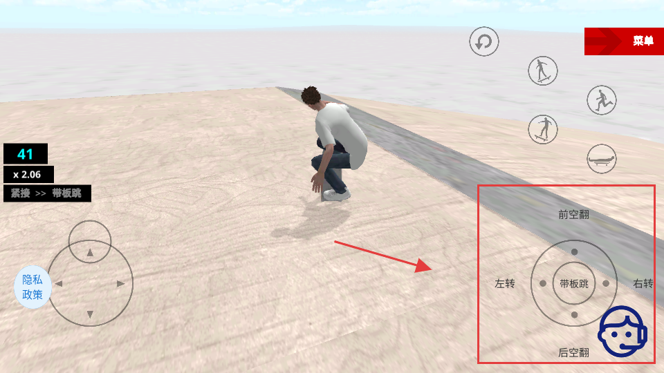 1、利用左下角方向按钮控制角色移动方向,规划路径前往赛道或障碍区域,为后续滑板技巧做准备。