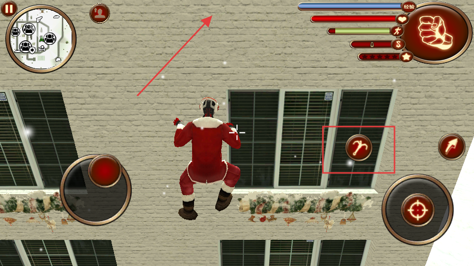 3、使用钩子武器可进行攀爬操作,如攀爬建筑物。