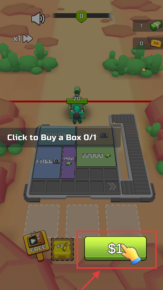 1、点击【$1】按钮购买盒子,获取资源,为后续对抗丧尸积累物资。