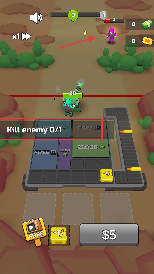 2、操控士兵消灭【紫色】敌人,完成【Killenemy0/1】任务,获取金币提升实力。