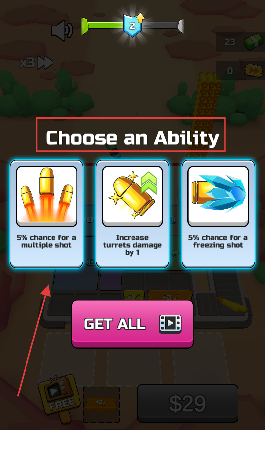 4、战斗升级后选择能力,如【多重射击】【增伤】【冰冻射击】,或看广告获全部增强战力。