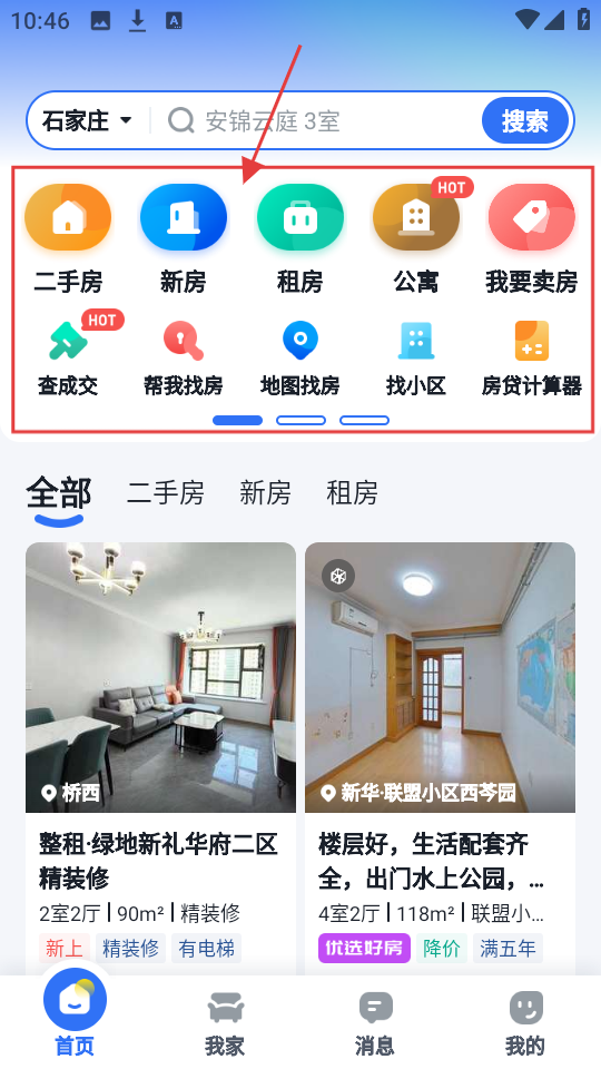 1、在首页,可选择二手房、新房、租房等功能入口,进入对应房源板块啦。