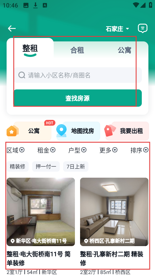 2、进入租房板块后,可选择整租、合租等类型,输入信息查找房源哦。