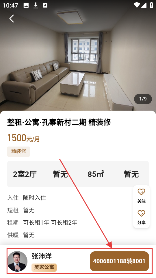 3、在房源详情页,可查看房源信息,点击联系方式可联系经纪人咨询啦。