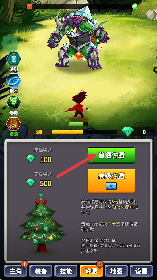 1、点击【普通许愿】,获取钻石奖励,积累资源,用于装备和技能升级。