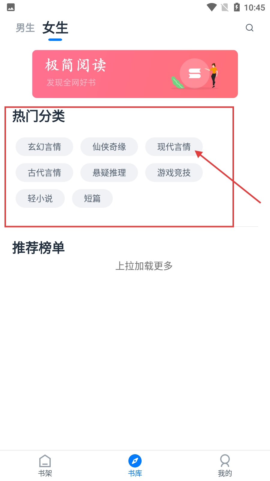 2、在书库的【女生】分类下,可选择【现代言情】等热门分类,快速筛选感兴趣的小说类型。