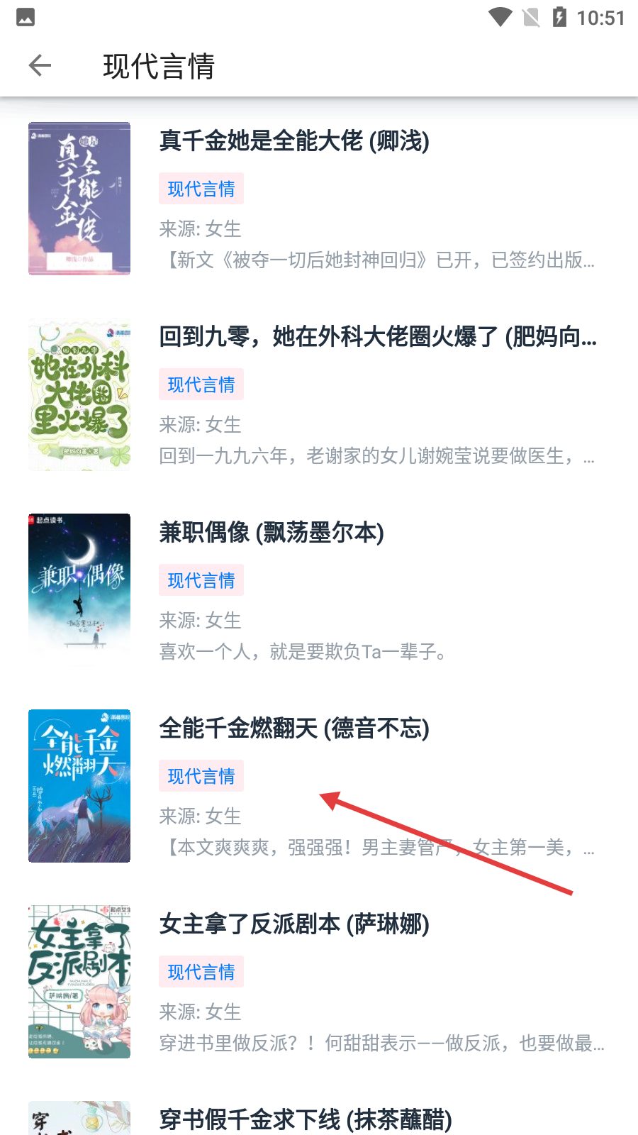 3、进入【现代言情】分类后,可浏览如《真千金她是全能大佬》《全能千金燃翻天》等多部小说,点击目标小说即可查看详情。
