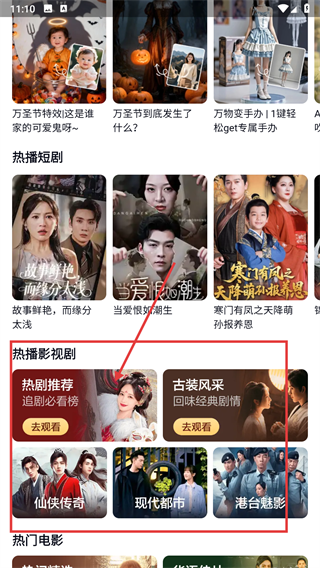 2、在功能界面的【热播影视剧】分类中,点击【热剧推荐-去观看】,可进入热门电视剧推荐页面。