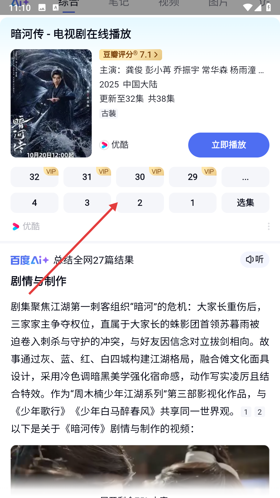 4、进入《暗河传》剧集详情页后,可查看该剧的豆瓣评分、主演、集数等信息,选择集数并点击【立即播放】即可开始观看。