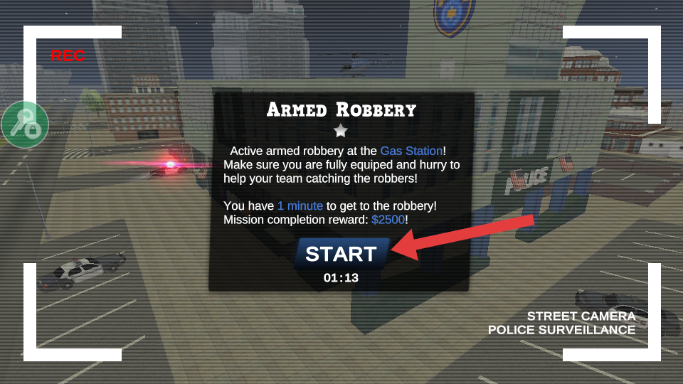 1、点击【START】,接受【Armed-Robbery】任务,在1分钟内前往加油站阻止抢劫,完成可获$2500奖励。