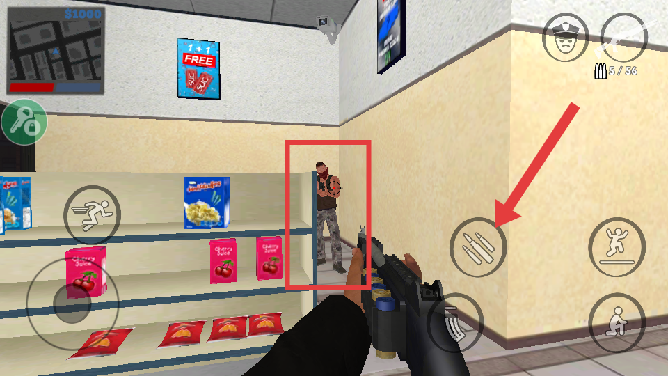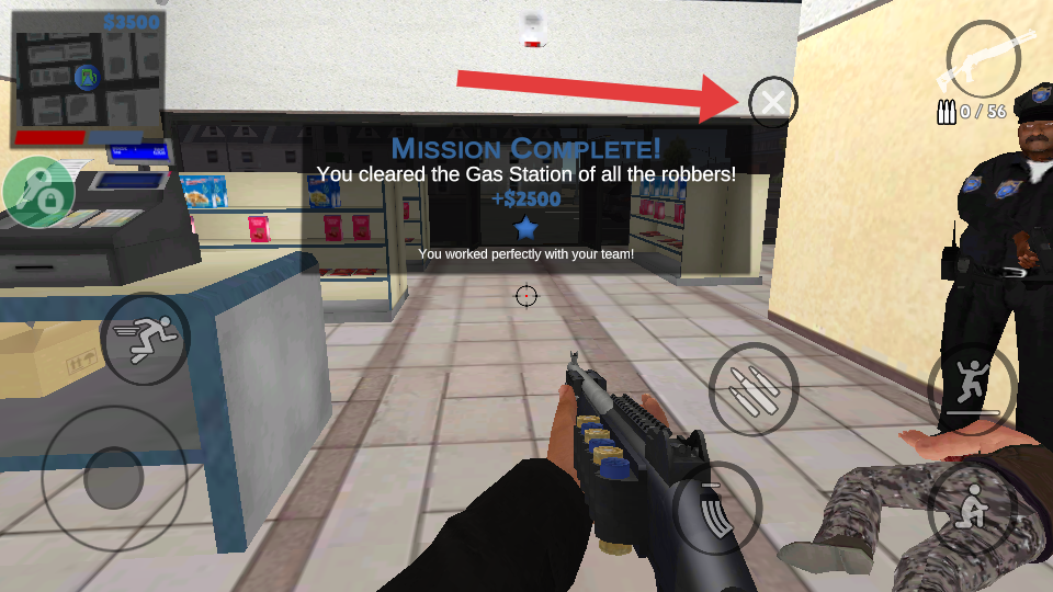 3、进入加油站后,瞄准劫匪,点击右侧【开火】按钮射击,消灭所有劫匪以推进任务。