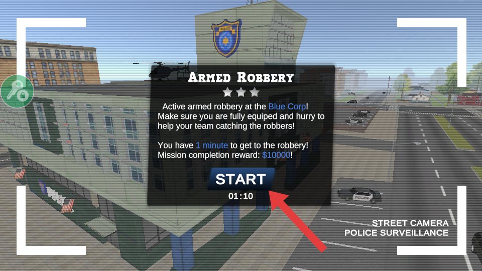 2、接受【Armed-Robbery】任务,在1分钟内赶往Blue-Corp阻止抢劫,点击【START】开始任务。