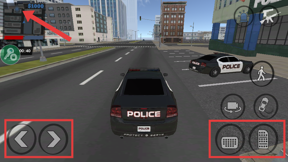 3、驾驶警车时,用左侧【方向键】控制转向,右侧【油门】和【刹车】控制车速,根据小地图指引前往任务地点。