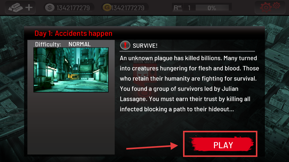 1、任务为生存,点击【PLAY】开启第一天任务,需消灭感染体以获取幸存者信任。