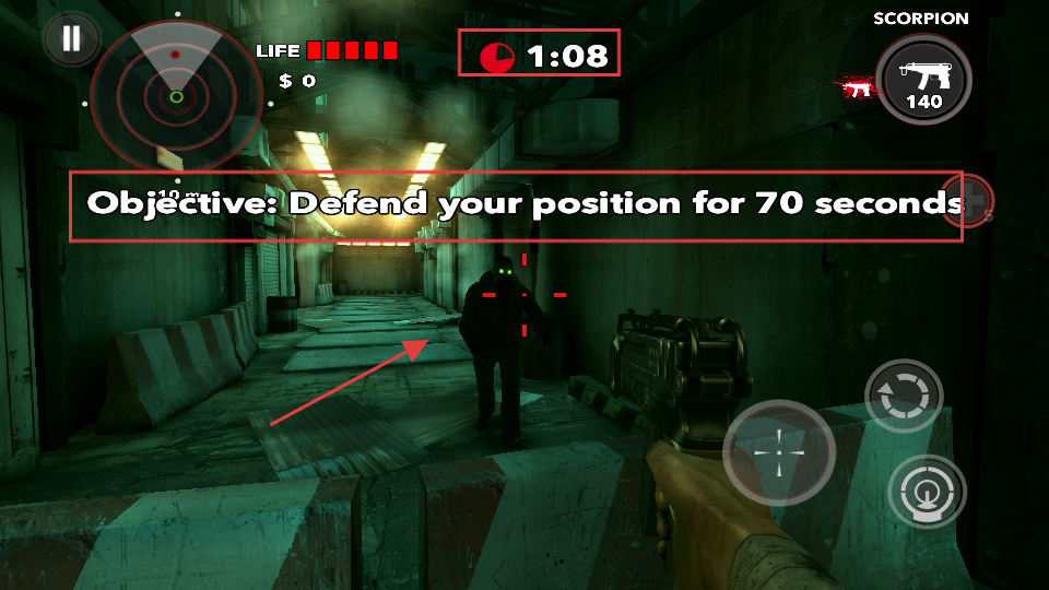 3、目标为防御70秒,射击来袭的感染者,留意剩余时间【1:08】和自身生命值,坚守阵地。