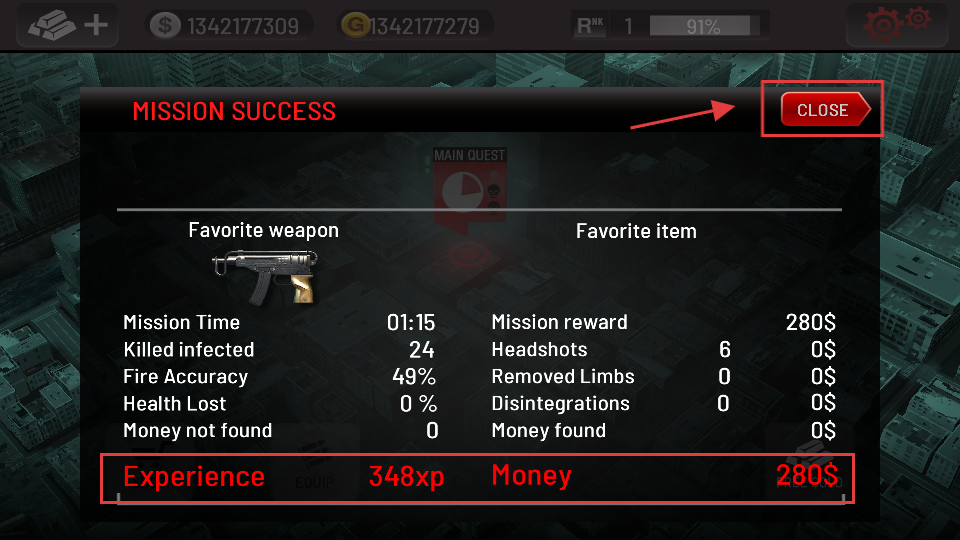 4、任务成功,可查看奖励【348xp】与【280$】等数据,点击【CLOSE】关闭任务结算界面。