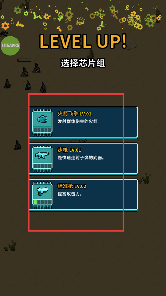 4、升级后选择芯片组,如火箭飞拳、步枪、标准枪,提升角色攻击能力。