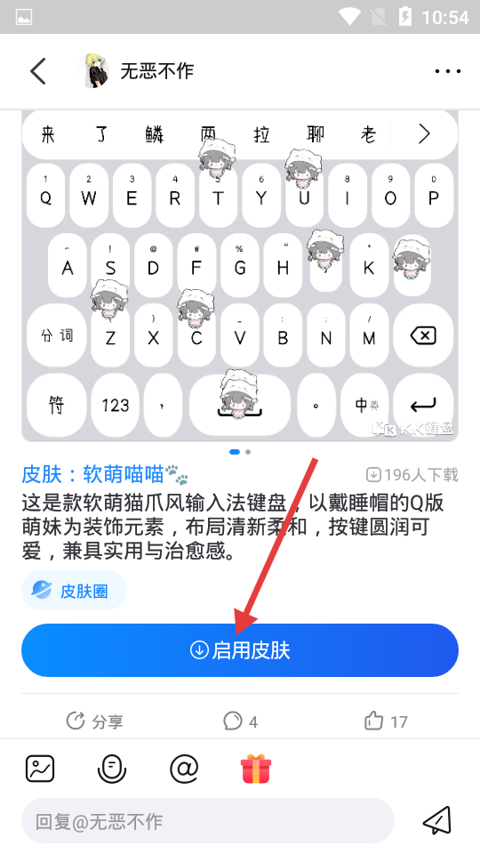 4、支持键盘个性换肤功能,搭配简洁界面设计,可根据喜好自定义外观,同时实时更新抖音热门套路语料,紧跟潮流。