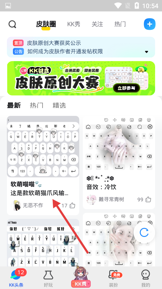 1、在KK键盘应用底部点击【KK头条】,进入皮肤圈页面。