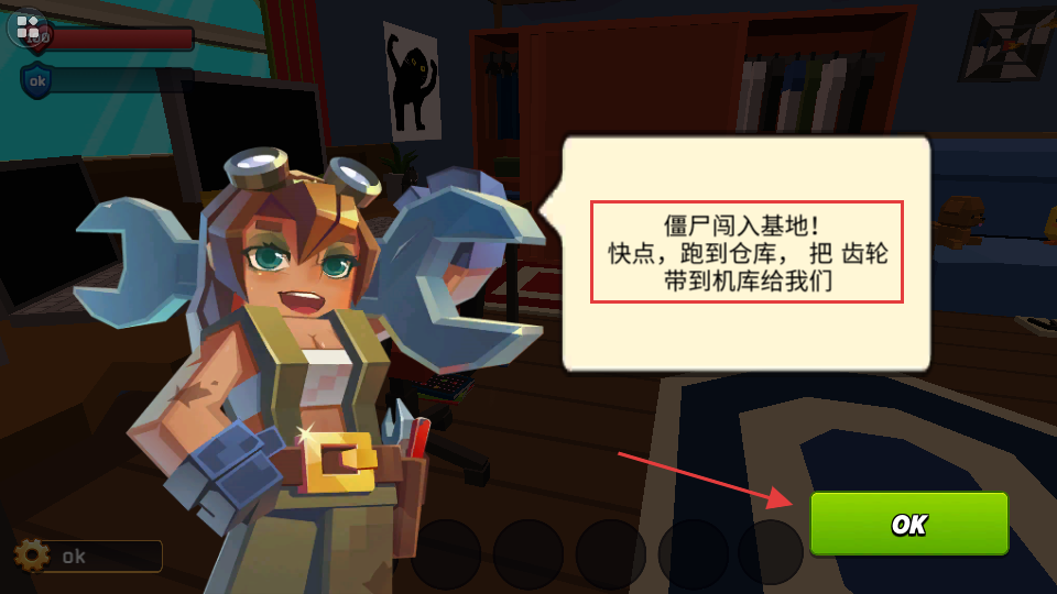 2、接收任务后点击【OK】确认,前往仓库获取【齿轮】,带到机库推进剧情,应对僵尸威胁。