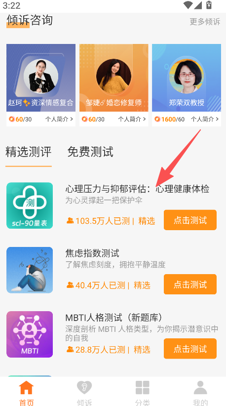 1、服务测试多元,涵盖倾诉咨询、多种心理测试、分类测评,心理健康服务全场景覆盖,用户需求一站式满足。