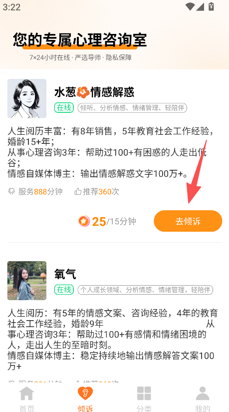 2、进入倾诉板块,选择咨询师,点击去倾诉。