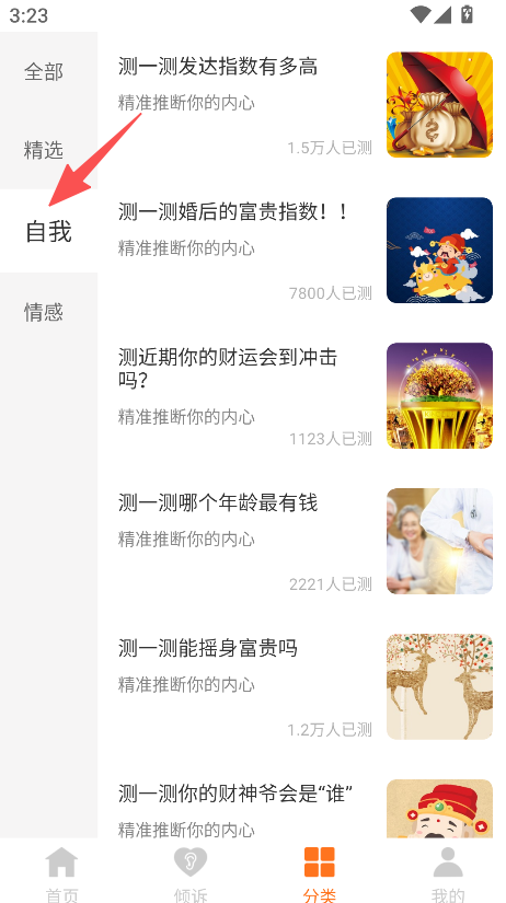 3、进入分类板块,选择自我类测评,开展相关测试。