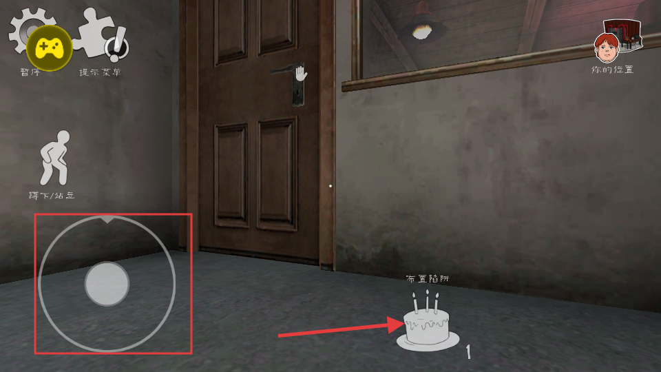 3、利用左侧虚拟摇杆控制角色移动,在场景中布置陷阱,如蛋糕陷阱,用于阻挡或攻击敌人,保障自身安全。