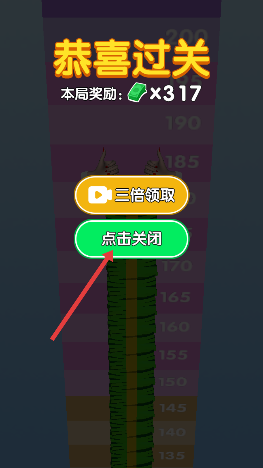 4、通关后,点击【点击关闭】按钮结束本局游戏并领取奖励。