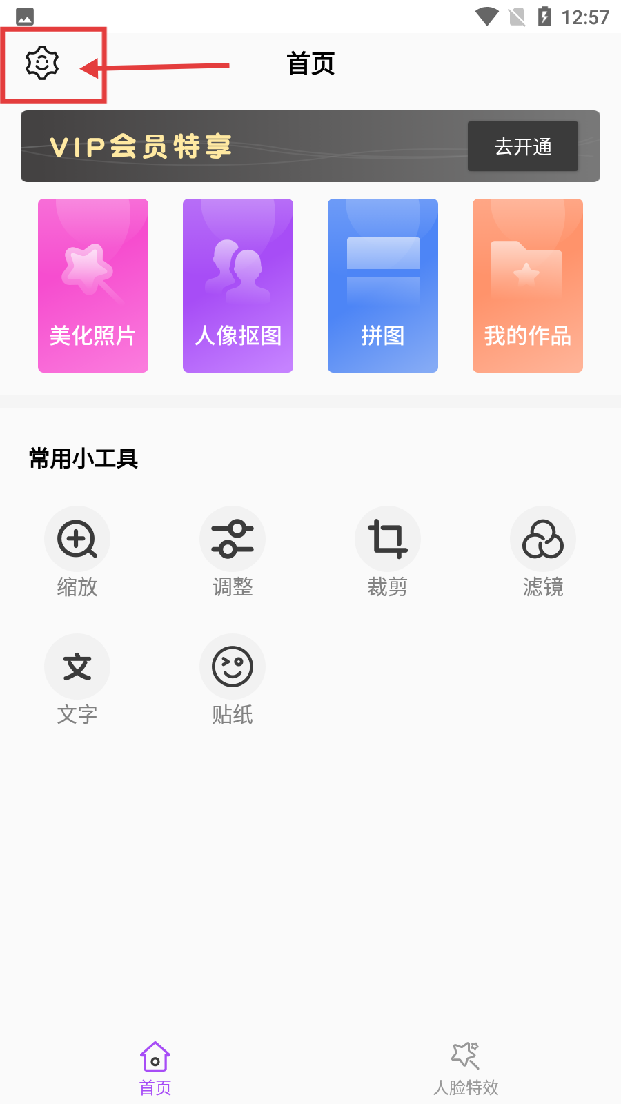 1、打开图片美化软件后,点击左上角的设置图标,可进入包含登录/注册等功能的设置界面。