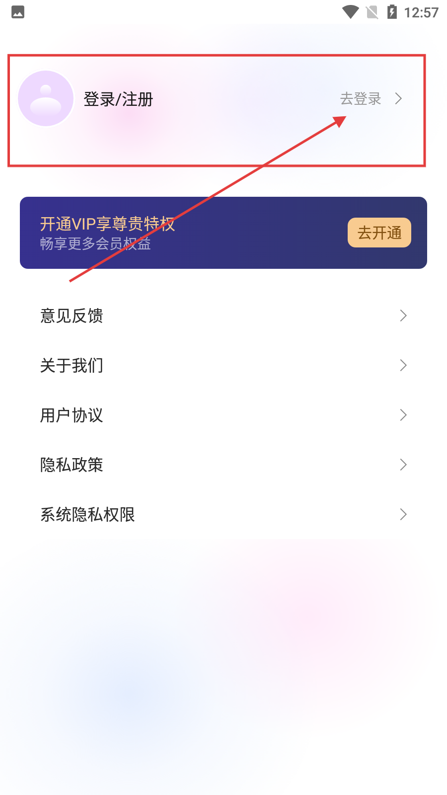 2、在设置界面,点击【登录/注册-去登录】区域,可进入用户登录界面。