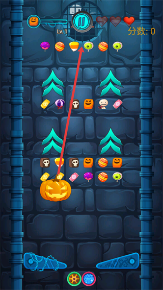 3、进入游戏后,操控南瓜收集糖果等元素,躲避骷髅等障碍物,积累分数。