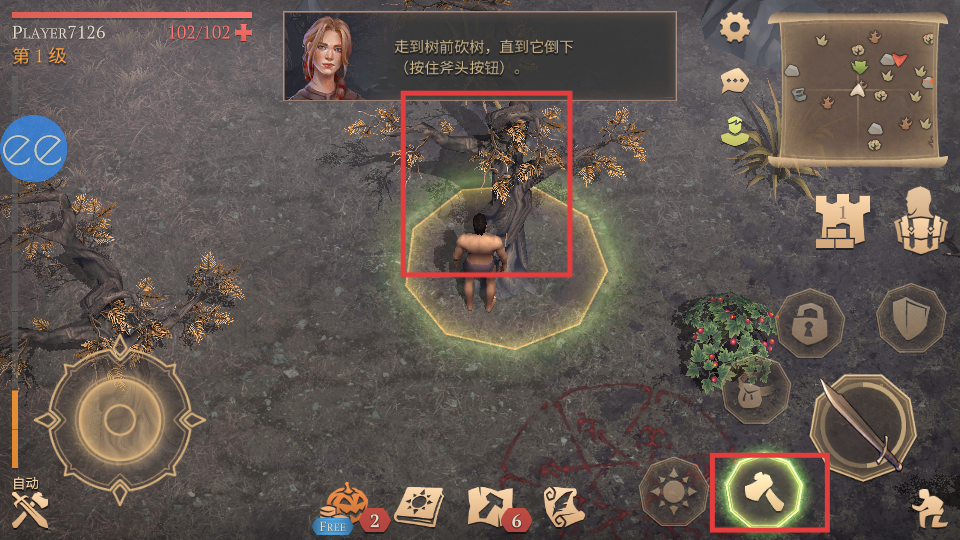4、走到树前,按住斧头按钮砍树,直到树倒下,完成砍树任务。