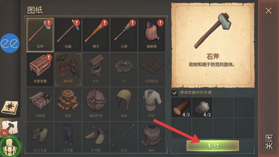 3、在图纸界面选择【石斧】,点击【制作】,获取砍树工具。