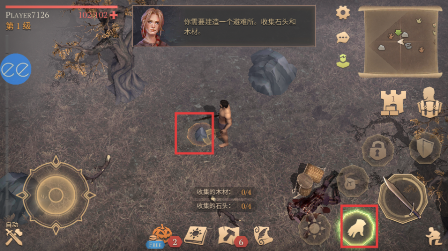 2、收集石头和木材,用于建造避难所,推进游戏任务。