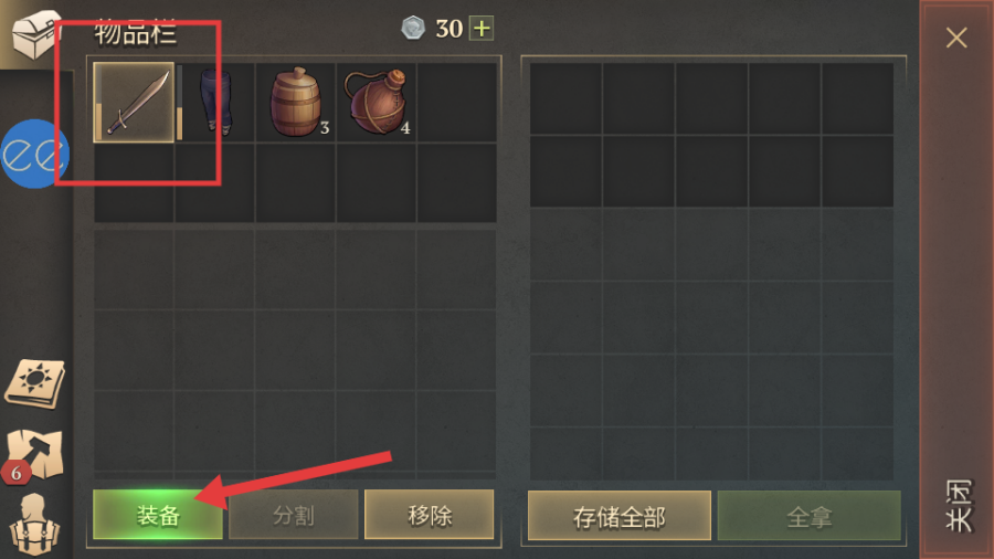 1、在物品栏中选择武器,点击【装备】,提升角色的战斗能力。