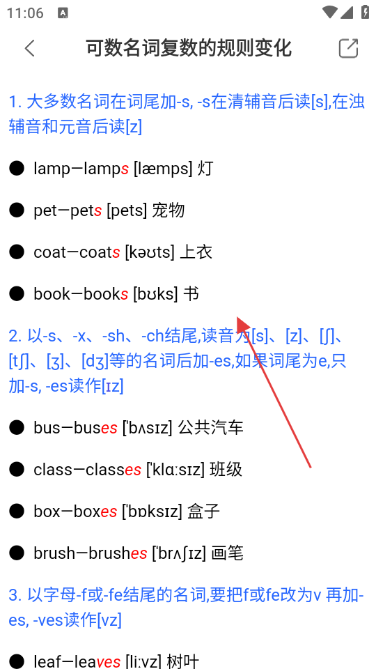 4、进入【可数名词】后,可查看【可数名词复数的规则变化】等详细语法知识。