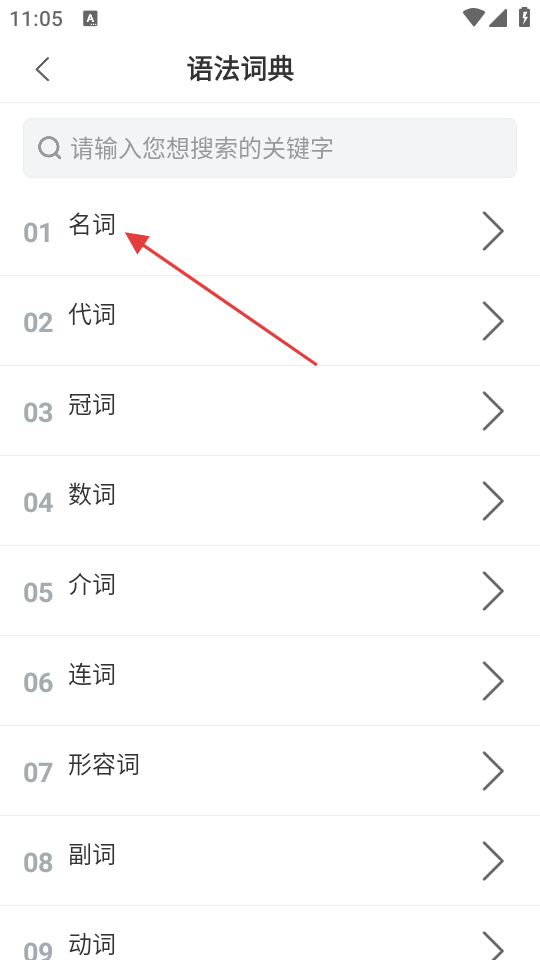 2、进入【语法词典】后,选择【名词】分类,可查看名词相关语法内容。