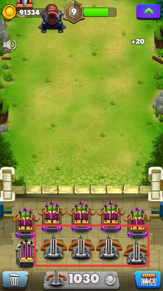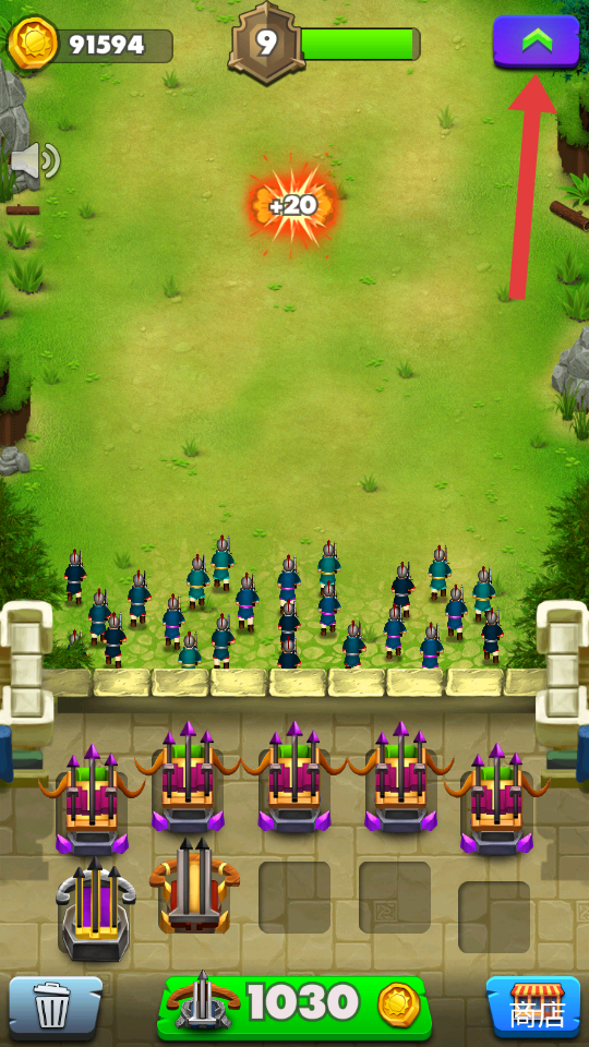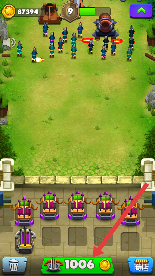 1、进入游戏后,点击下方绿色按钮购买弩箭,增强防御火力以抵御敌军。