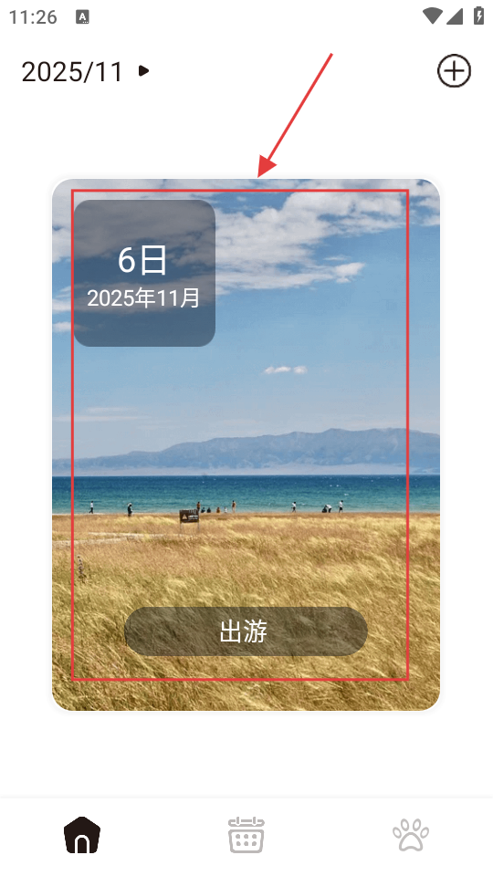 4、选择好封面并编辑日记内容后,可生成带有日期、封面和主题(如【出游】)的日记卡片。