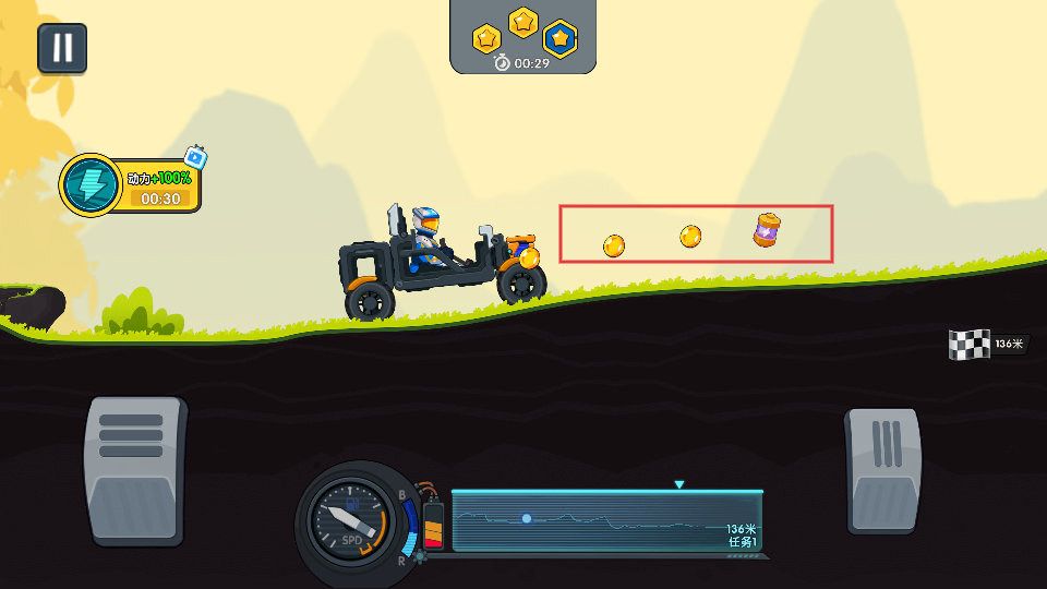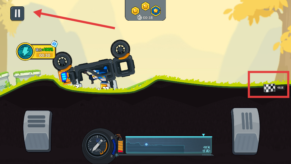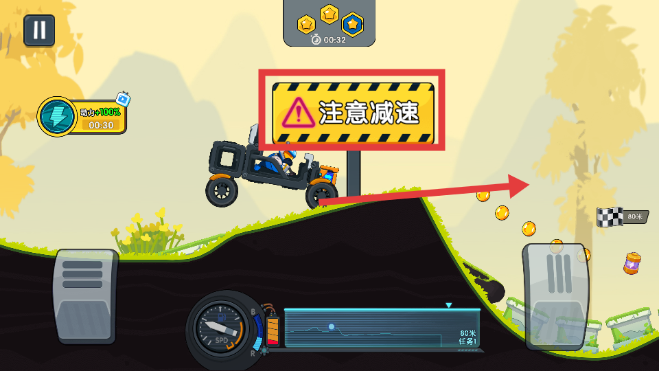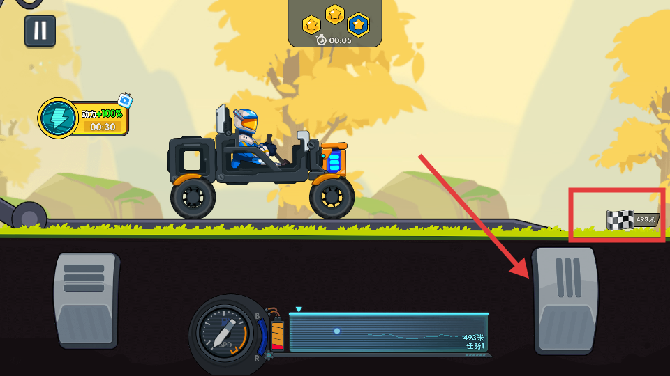 1、游戏中利用右侧的加速踏板控制车辆前进,注意右侧的距离标识,了解剩余行驶路程,合理规划驾驶节奏。