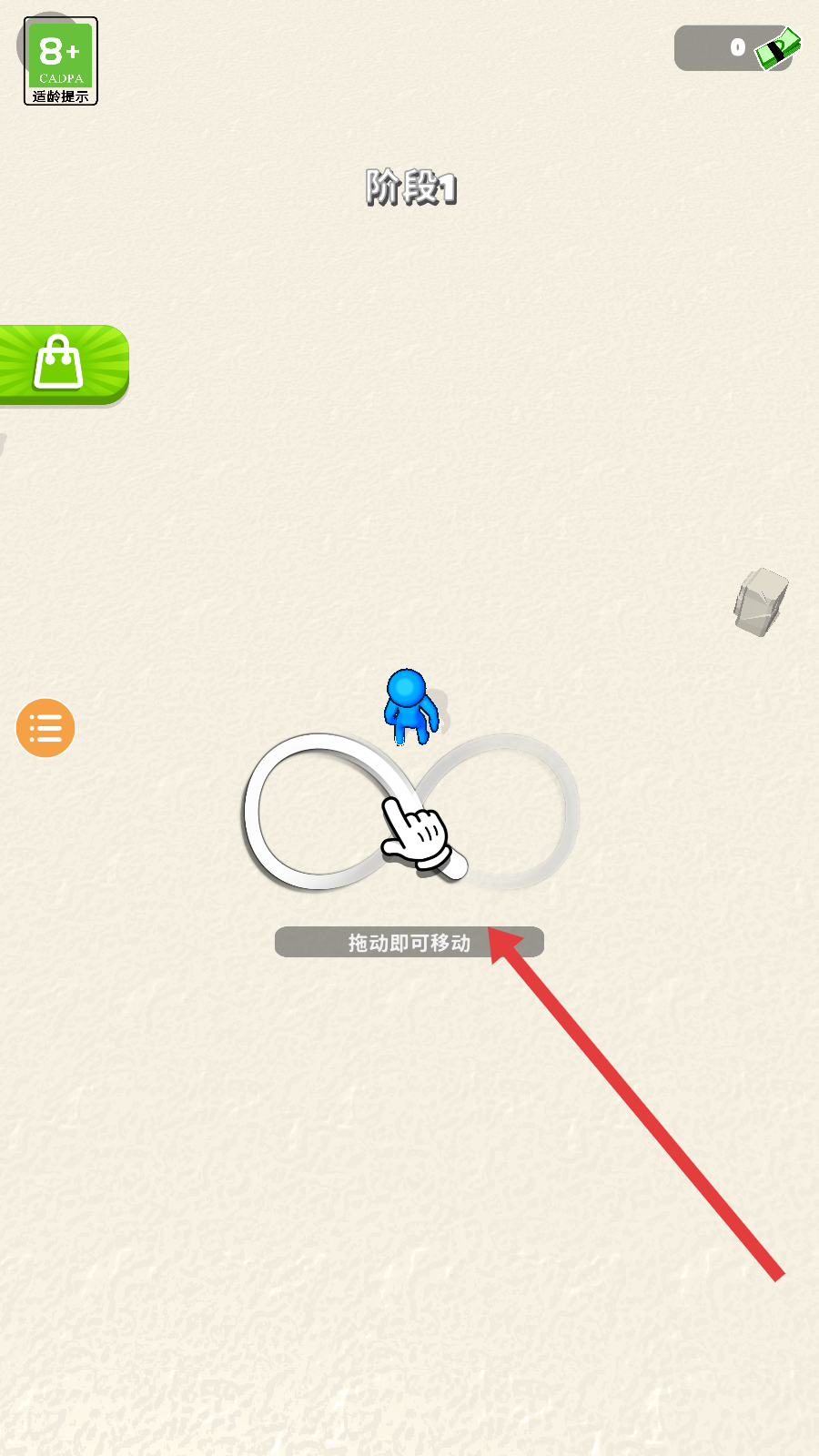 1、进入【阶段1】后,按照提示拖动可移动的环形区域,控制蓝色小人移动,开启游戏进程。