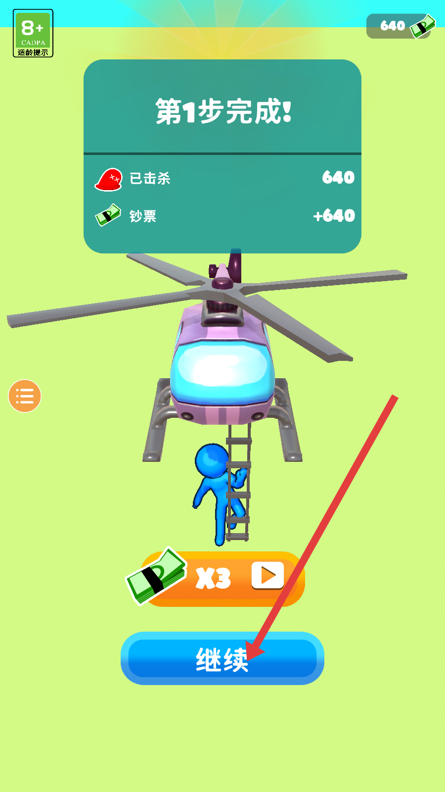 4、完成第1步后,界面会显示已击杀数量和获得的钞票,点击【继续】按钮可进入下一个阶段继续游戏。