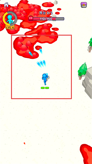 2、战斗中控制角色移动躲避红色敌人,利用已提升的射速持续射击,快速削减敌人数量推进关卡。