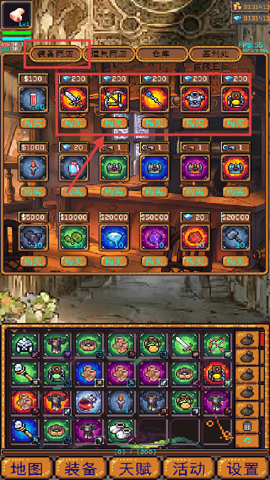 1、在【装备商店】用【钻石】买【200】钻装备提战力,整理背包方便取用。