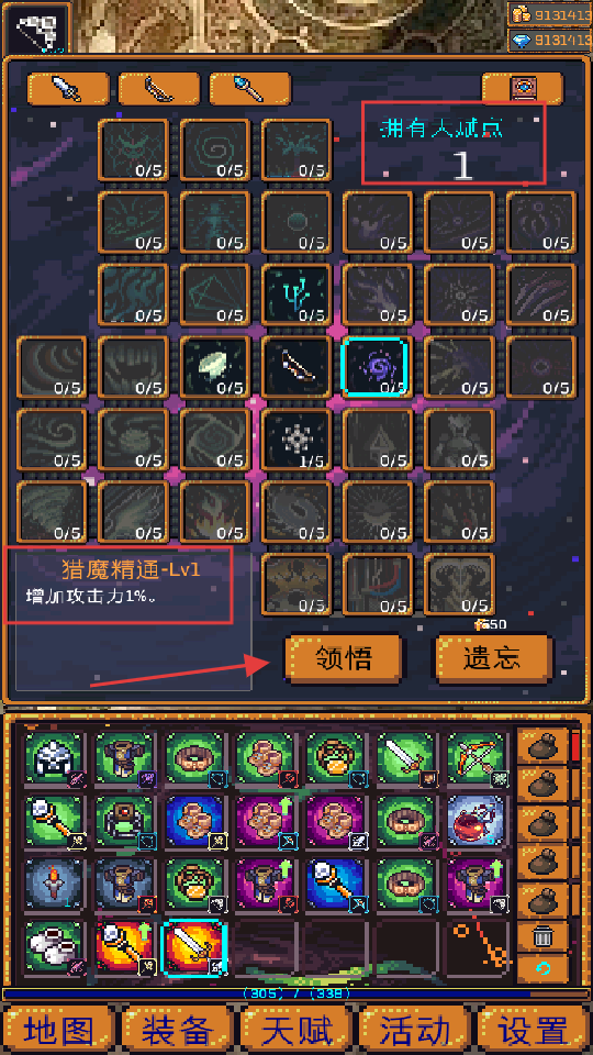 4、用【1】天赋点领悟【猎魔精通-Lv1】(攻加【1%】),优先点战斗天赋。
