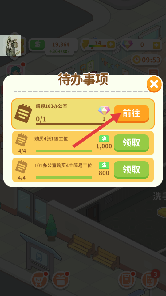 1、处理待办事项,点击【前往】解锁103办公室,推进公司建设。
